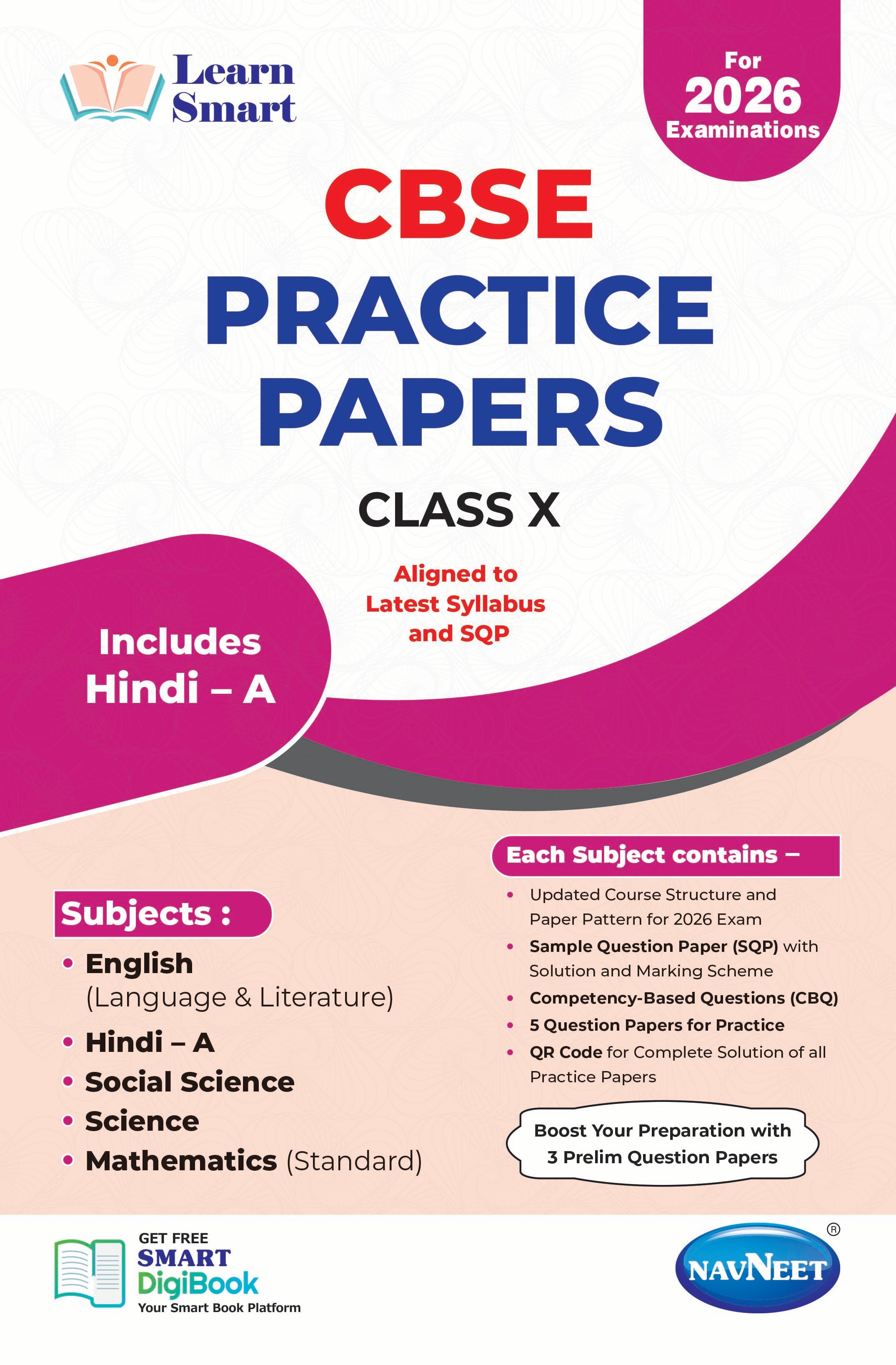 NAVNEET LEARN SMART – CBSE Practice Papers Class 10 For Board Exams 2026. Subjects Included - English, Hindi A, Social Science, Science, Mathematics (Standard). Each Subject contains -